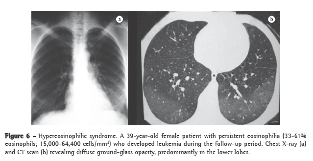 In a retrospective study involving 50 pati­ents,(58) 32 (64%) had central and peripheral nervous system involvement, including ataxia, cognitive and behavioral alterations, spasticity, peripheral polyneuropathy and cerebral infarction due to thromboembolic events. In 28 (56%), the skin was affected, some patients presenting dermatographism, angioedema or rash. More than half of the patients had skin, heart or nervous system involvement. In 20 (40%), the lungs were affected. Pulmonary infiltrates can be of the simple pulmonary eosinophilia, CEP or AEP type (Figure 6).