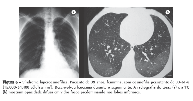 Em uma série retrospectiva com 50 pacientes,(58) o comprometimento do sistema nervoso, central e periférico, ocorreu em 64%, compreendendo ataxia, alterações cognitivas e de comportamento, espasticidade, polineuropatia periférica e infartos cerebrais devido a fenômenos tromboembólicos. A pele foi acometida em 56% e pode mostrar dermatografismo, angioedema e rash. Em mais de 50% dos casos, ocorreu o comprometimento de algum desses órgãos (pele, coração e/ou sistema nervoso). O pulmão foi acometido em 40%. Os infiltrados pulmonares podem ser do tipo eosinofilia pulmonar simples, PEC ou PEA (Figura 6). Pode haver intensa eosinofilia no LBA.