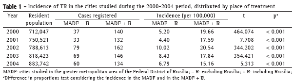 From 2000 to 2004, 714 new cases of TB involving residents of the ten MADF cities studied were reported. Of those 714 cases, 436 (61%) were reported and treated in Brasília, compared with 278 (39%) in the MADF cities studied (Figure 1). When only the cases treated in the MADF were considered, the mean 2000-2004 incidence of TB in the ten cities was found to range from 4.40 to 10.02/100,000 inhabitants. Calculating the incidence rates by adding the cases treated in the cities studied to those treated in Brasília resulted in a statistically significant (p < 0.001) increase in the mean values of this indicator in all of the cities studied. Thus calculated, the rates ranged from 15.16 to 20.54/100,000 inhabitants (Table 1).
