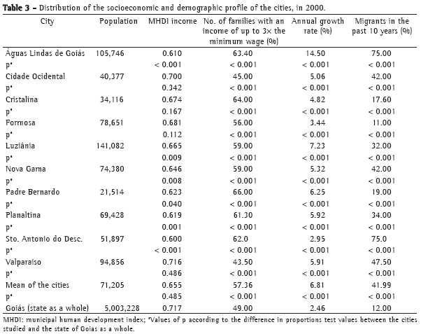 In the 2000 census, the demographic data for the cities studied (Table 3) showed a geometric rate of population growth of 6.14%, compared with 2.46% statewide. There was a statistically significant difference in terms of annual population growth, which was greater in all of the cities studied than in the state as a whole (p < 0.001). In the cities studied, the mean rate of migration from other states was 35.2% over the past 10 years, compared with 12% statewide, this rates being higher in all of the cities studied, except for the city of Formosa. The overall difference between the MADF cities studied and the state as a whole was statistically significant (p < 0.001).
