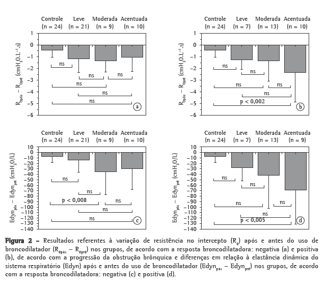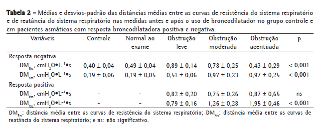 Para permitir uma descrição quantitativa dos resultados referentes às curvas de resistência do sistema respiratório (Rrs) e de reatância do sistema respiratório (Xrs), foi calculada a distância média (DM) entre as curvas pré-broncodilatador (Rrspré; Xrspré) e pós-broncodilatador (Rrspós; Xrspós) da Rrs (DMRrs) e Xrs (DMXrs) na faixa de ­frequência entre 4 e 16 Hz. Fisiologicamente, essas distâncias descrevem as variações nas propriedades resistivas e reativas (complacência e inertância) do sistema respiratório associadas ao uso do broncodilatador. Foram também analisados parâmetros derivados da TOF. Através da regressão linear da curva Rrs na faixa de frequência entre 4 e 16 Hz, foi obtida a resistência no intercepto (R0).(2,10,17) Com base na curva Xrs, foi calculada a elastância dinâmica do sistema respiratório na frequência de 4 Hz (Edyn = −2ω× f × Xrs, 4 Hz).(17,19) A análise de R0 e Edyn foi realizada utilizando os valores referentes à variação entre as medidas pré-broncodilatador e pós-broncodilatador nos diferentes grupos e subgrupos (controle, leve, moderado e acentuado; RB+ e RB−, respectivamente).