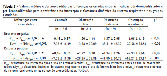 Assim, dando continuidade à pesquisa reportada anteriormente por nosso grupo nesta publicação,(10) este trabalho visa contribuir para aumentar nosso conhecimento sobre a resposta broncodilatadora em asmáticos adultos. Para esse fim, foi investigada a influência do nível basal de obstrução das vias aéreas nas alterações resistivas e elásticas decorrentes da prova broncodilatadora em asmáticos adultos.