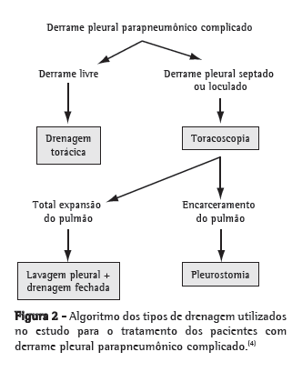 MétodosEstudo retrospectivo de 99 crianças (3 meses a 12 anos), 60 (60%) do sexo masculino e idade média de 2,6 anos, portadoras de DPPC na fase fibrinopurulenta, que foram submetidas à toracoscopia no Hospital de Clínicas de Porto Alegre (HCPA) e no Hospital Moinhos de Vento (HMV) em Porto Alegre (RS), assim como no Hospital Geral de Caxias do Sul (HGCS) em Caxias do Sul (RS), no período entre novembro de 1995 e julho de 2005. O manejo desses pacientes foi realizado usando-se o mesmo algoritmo de tratamento (Figuras 1 e 2).(4) Em cada hospital estudado, os seguintes dados foram coletados dos prontuários: idade; sexo; realização de toracocentese; uso de antibiótico prévio à cirurgia; aspecto macroscópico, bioquímica, bacterioscopia e cultura do líquido pleural; tempo do início do quadro clínico até a realização da toracoscopia; tempo de drenagem torácica; tempo de internação; eficácia da toracoscopia; e necessidade de outro procedimento cirúrgico.