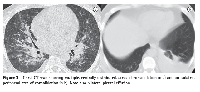 Pleural effusion, septal thickening and areas of ground-glass attenuation (as were found in the present case series) accompanied by nodules and areas of consolidation have also been described in the literature, at varying frequencies of occurrence.(2,3,8,13-19) Table 2 summarizes the frequency of our findings in relation to that of other studies.