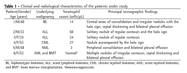 DiscussionThe present study described the tomographic findings in six patients with leukemia after chemotherapy or BMT, diagnosed with IPA.