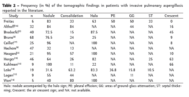 Nodules and areas of consolidation are the principal findings in patients with IPA.(2,3,8,13-19). According to one group of authors,(15) nodules are the initial findings, and a halo sign is indicative of progression to consolidation and, subsequently, cavitation. Therefore, the variation in the time elapsed between the onset of the pathophysiology of IA and the time of diagnosis might explain why certain studies report nodules as being the most common finding and others report areas of consolidation as being the most common finding.