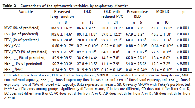 Table 2 compares the spirometric variables by respiratory disorder. In our sample, 8 patients (12.3%) were classified as presenting normal spirometry results, 18 (27.7%) were classified as having OLD, 24 (36.9%) were classified as having OLD with reduced FVC, 10 (15.4%) were classified as having MORLD and 5 (7.7%) were classified as having presumptive RLD. The FEV1 values were significantly lower in the OLD with reduced FVC group and in the MORLD group than in the other groups-the OLD group, the presumptive RLD group and the preserved lung function group (p < 0.001). Of the 8 patients classified as having preserved lung function, only 1 presented MFEF25-75% and FEF75% values below the lower limit of normality and 2 presented values FEF75%/FVC below 0.25.