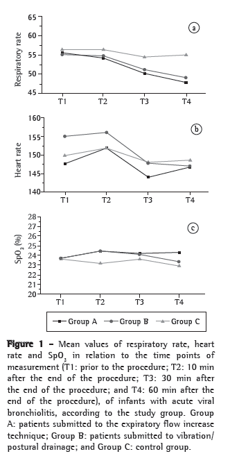 Objective: To compare the expiratory flow increase technique (EFIT) and vibration accompanied by postural drainage (PD) in terms of their effects on the heart rate (HR), respiratory rate (RR) and SpO2 of infants with acute viral bronchiolitis (AVB). Methods: Infants with clinical and radiological diagnosis of AVB were analyzed. The HR, RR and SpO2 were registered at four time points: prior to the procedure; and at 10, 30 and 60 min after the procedure. The patients were divided into three groups: submitted to the EFIT; submitted to vibration/PD; and control. Results: We included 81 infants, 27 per group, with a mean age of 4.52 years and a mean weight of 6.56 kg. Using ANOVA, we found that the EFIT and vibration/PD groups presented no significant differences in relation to the control group in terms of the mean values for HR, RR or SpO2 (p > 0.05). Considering only the four time points evaluated, the mean RR was significantly lower in the EFIT and vibration/PD groups than in the control group (p < 0.05). Conclusions: In terms of overall improvement of cardiorespiratory parameters, neither the EFIT nor vibration/PD provided any benefit to infants with BVA. However, over time, respiratory physical therapy seems to contribute to decreasing the RR in these patients.