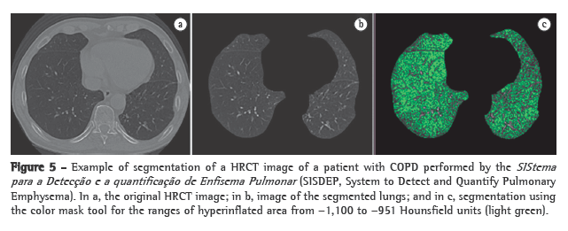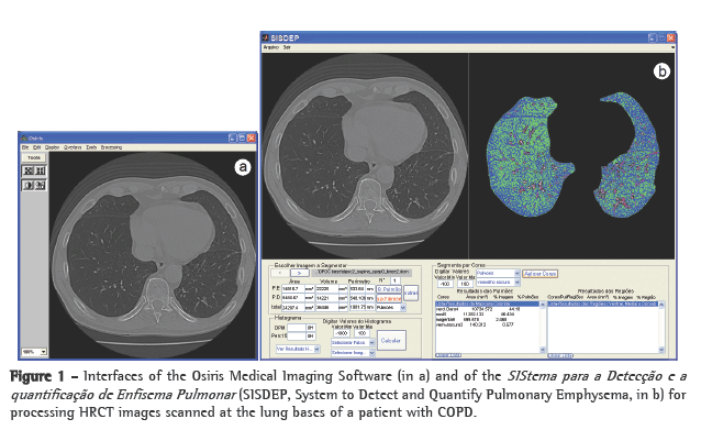 We have recently developed a computer vision system, which we have designated the SIStema para a Detecção e a quantificação de Enfisema Pulmonar (SISDEP, System to Detect and Quantify Pulmonary Emphysema). The SISDEP incorporates tools for use with HRCT images, i.e., tools that can segment the lung parenchyma with precision, allowing the automatic collection of quantitative data regarding lung aeration and the estimation of the degree of emphysema in CT slices.(10,11)