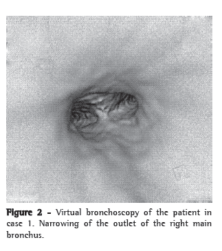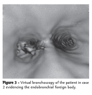 Serious respiratory sequelae, such as recurrent pulmonary infections, bronchiectasis and destruction of the previously healthy lung parenchyma, can result from FBA. Therefore, early diagnosis and intervention are fundamental for better management of this condition.(6) Definite treatment is conducted by bronchoscopy, an invasive procedure, which, although simple, is not free of complications and risks. Virtual bronchoscopy (VB) is a relatively new, non-invasive, procedure that provides a three-dimensional view of the internal walls of the tracheobronchial tree through the reconstruction of axial images.