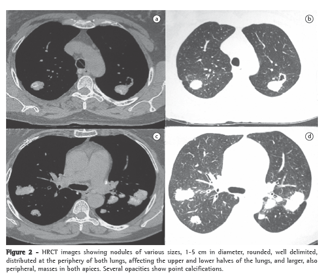 An HRCT scan of the chest revealed bilateral, round, well-delimited nodules with peripheral distribution, together with nodules ≤ 5 cm, with the same characteristics, in the apices. Many of the opacities showed point calcifications. Small centrilobular nodules, with slight ground-glass attenuation, were observed in the upper regions of both lungs. There was adenopathy with mediastinal calcification (Figure 2).