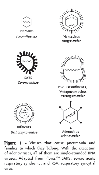 Therefore, influenza A and B, RSV, parainfluenza, metapneumovirus, coronavirus, rhinovirus, hantavirus and adenovirus are among the viruses that cause community-acquired pneumonia. A chart with the structure of these viruses is shown in Figure 1.(14)
