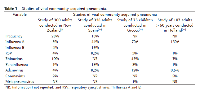 There have been few studies of viral infections causing community-acquired pneumonia. However, in recent years, there have been studies of this subject using multiple diagnostic approaches and including the modern techniques mentioned above. Some of these studies are summarized in Table 1. In a study of 300 adult individuals with community-acquired pneumonia conducted in New Zealand, 28% of the cases were of viral etiology. The viruses detected were rhinovirus (in 10%), influenza A (in 8%), influenza B (in 2%), RSV (in 4%), adenovirus (in 4%), coronavirus (in 2%) and parainfluenza (in 1%). In addition, more than one type of virus was found in some patients. Those authors observed that the patients with viral pneumonia presented more myalgia than did those with bacterial infection. They also observed that simultaneous rhinovirus and pneumococcal infection was associated with more severe pneumonia.(9)