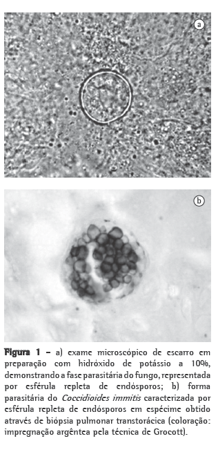O exame direto deve ser feito como rotina em qualquer material suspeito: escarro, líquido cefalorraquidiano, exsudato de lesões tegumentares, pus de abscesso, lavado brônquico, aspirado de lesões ósseas e de articulações, urina, aspirado de medula óssea e linfonodos, etc. A pesquisa é feita em preparados com solução de hidróxido de potássio a 10% para demonstrar os elementos parasitários característicos de C. immitis. A visualização de esférulas imaturas permite um diagnóstico presuntivo, mas esses elementos podem ser confundidos com outros agentes fúngicos, principalmente os da PCM. Entretanto, o achado de esférulas maduras, repletas de endósporos, é patognomônico e definitivo para o diagnóstico (Figura 1). Nos líquidos orgânicos, o exame deve ser realizado no sedimento de material centrifugado até 3 h após sua coleta. Além do exame a fresco com hidróxido de potássio, o material pode ser distendido em lâminas e corado pelo ácido periódico de Schiff e por impregnação argêntea de Gomori-Grocott.(4,12,,26,38)
