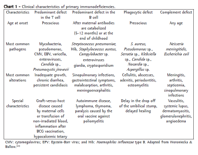 The following are key aspects in the clinical history: age at onset, location probable etiology, frequency and severity of the infections, as well as the presence of postinfection complications, hospitalizations and severe post-vaccination reactions caused principally by live attenuated vaccines, such as BCG, oral poliomyelitis, rotavirus, yellow fever, measles/mumps/rubella and varicella vaccines. For instance, patients with chronic granulomatous disease can present systemic infections caused by Mycobacterium bovis after BCG vaccination, and patients with congenital agammaglobulinemia can develop poliomyelitis after taking the Sabin vaccine.(33)