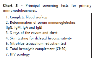The principal screening tests for the investigation of PIDs in Brazil are shown in Chart 3. The results should be interpreted very carefully and always compared with the reference values for individuals of the corresponding age bracket.
