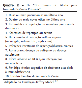 Em 1999, a Fundação Jeffrey Modell em conj]unto com a Cruz Vermelha Americana publicaram os "Dez Sinais de Alerta" para IDP com o objetivo de facilitar o raciocínio clínico acerca dos pacientes que necessitam de investigação laboratorial. Esse conjunto de pontos de alerta foram adaptados ao nosso meio pelo Grupo Brasileiro de Imunodeficiência(17) e encontram-se no Quadro 2. A presença de um ou mais desses dez sinais de alerta torna obrigatória a investigação laboratorial para uma possível IDP.