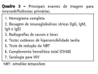 Os principais testes de triagem para a investigação de IDPs em nosso meio encontram-se no Quadro 3. Muito cuidado deve ser dispensado na interpretação dos resultados, que devem ser sempre comparados aos valores de referência para indivíduos da faixa etária correspondente.