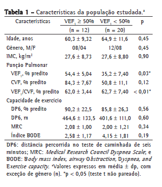A população estudada foi de 32 pacientes, sendo alocados 12 (38%) no grupo VEF1 ≥ 50%, e 20 (62%) no grupo VEF1 < 50%. As características da amostra estudada encontram-se na Tabela 1.