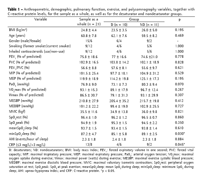 The results are expressed as mean ± standard deviation. The Mann-Whitney test was used to compare the groups in terms of SpO2 during exercise and during sleep. The Student's t-test was used for the other numerical data, and Fisher's exact test was used for nominal variables. The chi-square test was used to compare the groups in terms of CRP levels. Spearman's linear correlation test was used to assess the correlation between the variables related to SpO2 during sleep and the other relevant variables. In addition, a partial correlation analysis was carried out to determine the degree of influence that significant variables had on a final variable-mean SpO2 during sleep. The primary outcome measure of the present study was nocturnal oxygen desaturation. Considering a mean incidence of nocturnal oxygen desaturation of 45%,(1) it was estimated that the evaluation of 20 patients (10 in each group) would allow exploratory associative analyses among the principal variables of interest. Values of p < 0.05 were considered statistically significant. The statistical analysis was carried out using the Statistical Package for the Social Sciences, version 13.0 for Windows (SPSS Inc., Chicago, IL, USA).