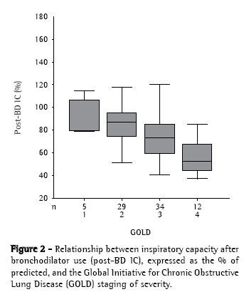 The GOLD severity stages take into account the degree of obstruction based on post-BD FEV1 (% of predicted).(1) The GOLD stages 3 and 4, or < 50% FEV1 (% of predicted), correlated with <70% IC (% of predicted).