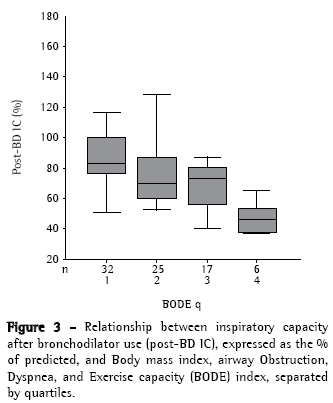 Various factors account for exercise intolerance in patients with COPD, although airflow limitation and peripheral muscle dysfunction play important roles.(10,11) In COPD, the loss of lung elastic recoil and progressive expiratory airflow limitation promote air trapping, with increased functional residual capacity and decreased IC. Static hyperinflation and its increase during exercise (dynamic hyperinflation) have been associated with exercise intolerance in individuals with COPD.(11,12) Reduction of hyperinflation, expressed as an increase in post-BD IC, correlates with better exercise tolerance and reduction of dyspnea.(13) There is also a correlation between a lower IC/TLC ratio and higher mortality.(14)