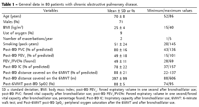 This was a cross-sectional, descriptive study, comprising 80 stable patients with COPD. Inclusion criteria were as follows: being over 35 years of age; having a smoking history of more than 20 pack-years; and presenting a post-BD FEV1/FVC (% of predicted) lower than 70% in the functional evaluation. Patients were selected from two Pulmonology Units in Brasília and were monitored for at least two months, presenting good compliance with treatment, which was instituted according to symptoms and severity, as per the GOLD guidelines.(1) The following exclusion criteria were applied: presenting unstable disease; using high doses of oral corticosteroids (= 40 mg of prednisone); having used antibiotics within the four weeks preceding the study outset; and presenting uncontrolled comorbidities, such as myopathies, peripheral vascular disease, and rheumatic/orthopedic diseases that impair locomotion, as well as coronary ischemia and arrhythmia.