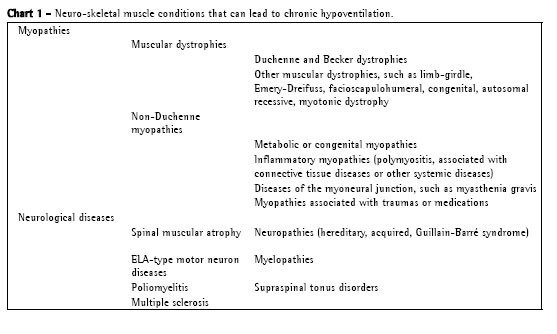 Respiratory muscle strength impairment can occur in various neuromuscular diseases (Chart 1). In cases of cervical spine trauma, the loss of respiratory capacity is acute and irreversible. When muscular dystrophies, neurological disorders and myoneural junction diseases affect the respiratory muscles, they present an evolution of a different sort, presenting outbursts, or progressive worsening, at varying rates of speed.