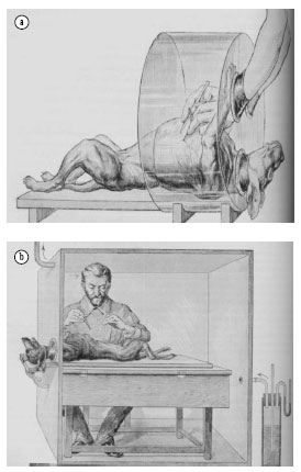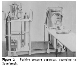 The first device designed as a substitute for spontaneous ventilation in individuals who, for some reason, no longer present adequate recirculation of air in the alveolar spaces, came to be widely used in the USA beginning in the 1930s. Built by an engineer in the Hospital of Harvard University,(2) it was dubbed the iron lung. At that time, there was a poliomyelitis pandemic, in which many people died from the paralytic respiratory form of the disease, due to the fact that there was no mechanism available that could be used as a substitute for ventilation. The need for a machine that could ventilate patients was imperative, and the knowledge of respiratory physiology available at that time led to the construction of this device (the iron lung), which was similar to the Sauerbruch chamber. It consisted of a steel cylinder, enclosing the body of the patient up to the neck, leaving only the head outside the chamber, and was powered by an electric motor that periodically generated subatmospheric pressure inside the cylinder, provoking the expansion of the chest cavity. This volume increase of the chest caused the intrathoracic pressure to drop and the air to be aspirated into the airways. Curiously, when the machine had to be temporarily performing thoracic surgery in a hypobaric chamber: shut off, a transparent dome was placed over the head of the patient, within which positive pressure was produced. A similar positive pressure device was described by Sauerbruch in his book, published in 1922(1) (Figure 2), although the author frankly stated that he preferred the negative pressure chamber, his creation, for fear of the hazardous effects that positive pressure might have on the lungs.
