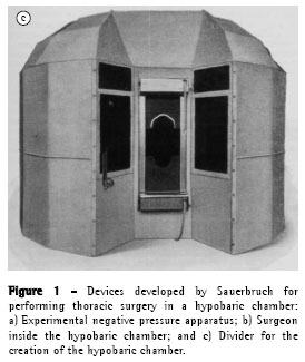 In order to circumvent this difficulty created by the pressure difference, Sauerbruch(1) developed a chamber for chest surgery (Figure 1). In this chamber that he created, the patient about to undergo surgery was positioned with the head outside the chamber, under the care of the anesthesiologist. The surgical team and the remaining part of the body of the patient stayed inside the chamber, where the pressure produced by air suction pumps was lower than the atmospheric pressure by approximately 7 mmHg. Communication between the interior and exterior sides of the chamber was sealed around the neck of the patient by a sort of adjustable mobile sealer clip. The head outside the chamber and the subatmospheric pressure around the chest permitted the opening of the chest without collapse of the lungs, maintaining spontaneous ventilation.