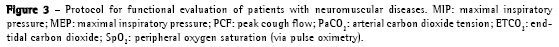 Therefore, in each respiratory evaluation, it is recommended that the following be performed: pulse oximetry; measurements of vital capacity and forced expiratory volume in one second in two positions (sitting and in the dorsal decubitus position), in order to make the test more sensitive; measurement of maximal inspiratory and maximal expiratory pressures; and the determination of peak cough flow.