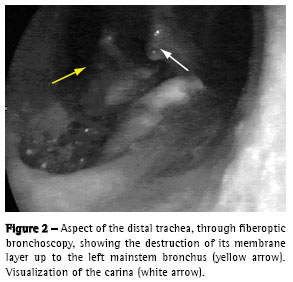 The control chest X ray, after upper digestive endoscopy, revealed left pneumothorax. Left thoracic drainage was performed with immediate lung re-expansion. In the fiberoptic bronchoscopy, we observed an area of destruction of the distal trachea, carina and left bronchus of approximately 3 x 1.5 cm (Figures 2 and 3), as well as exposure of the mediastinal tissue, together with de-epithelization and retraction of the epiglottis and right vocal chord.