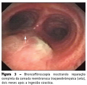cáustica. Relatamos o caso de um paciente de 27 anos com história de ingestão cáustica havia catorze dias, com dor retroesternal em queimação, fraqueza, tosse com escarro purulento e dispnéia associada à rouquidão no último dia. A endoscopia digestiva alta e a broncofibroscopia revelaram fístula esôfago-traqueal. O tratamento consistiu no suporte clínico, drenagem torácica bilateral, exclusão do transito esofágico com esofagostomia cervical terminal e gastrostomia. Houve cicatrização espontânea da fístula esôfago traqueal em seis semanas. Posteriormente, realizou-se a reconstrução do trânsito alimentar através de faringocoloplastia. A evolução pós-operatória foi satisfatória.