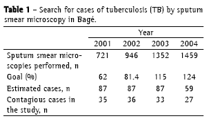 The goal of the PNCT is that 1% of the population of the city be investigated through direct sputum smear microscopy.(11) In Bagé, the population predicted for 2005 was 120,129 inhabitants.(14) Therefore, it was stipulated that, from 2001 to 2004, there would be 1180 sputum smear microscopy analyses (of the first sputum sample) performed annually.(11) The expected number of new cases of pulmonary TB for the 2001-2003 period was 87 per year. However, this number dropped to 59 for 2004. The goal of reaching 1% of the population was reached in 2003 and 2004(15) (Table 1).
