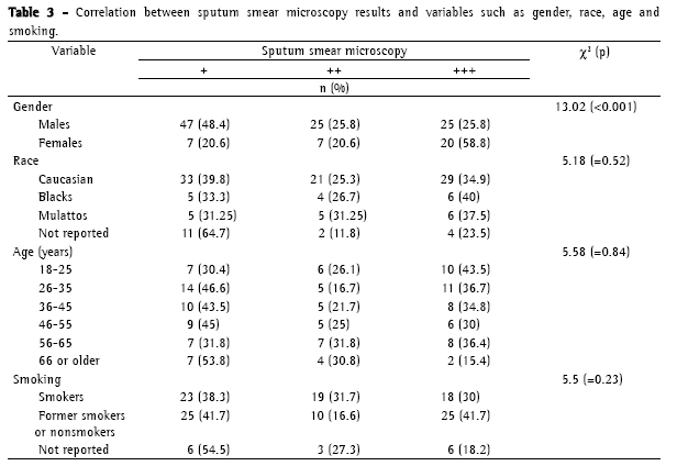 When the association of gender with sputum smear microscopy results was analyzed, 58.8% of the females and 25.8% of the males presented '+++' (p < 0.001) (Table 3). In the same analysis, 34.9% of the Caucasians, 40% of the Blacks, and 37.5% of the Mulattos presented '+++' (p = 0.52) (Table 3). The '+++' status was presented in the following age brackets at the following percentages: 18-25 years, 43.5%; 26-35 years, 36.7%; 36-45 years, 34.8%; 46-55 years, 29.3%; 56-65 years, 36.4%; and over 66 years, 15.4% (p = 0.84) (Table 3). Regarding smoking and sputum smear microscopy results, we observed that 30% of the smokers and 41.7% of the former smokers/nonsmokers presented '+++' (p = 0.23) (Table 3).