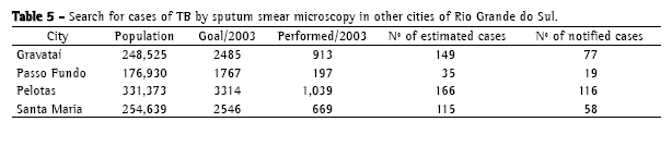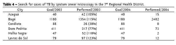 From 2001 to 2004, the search for new cases of TB in Bagé increased significantly and actually exceeded the goal in the last two years. Simultaneously, the number of new cases has decreased. The fact that the goals were exceeded is likely attributable to increased treatment-seeking behavior, the broader dissemination of the service in the city, and the good quality of the active search for new cases. For comparison purposes, we show the 2003 and 2004 data for the TB priority cities within the 7th Regional Health District(15) (Table 4). It can be observed that Bagé was the only city that managed to reach the goal of investigating 1% of the population through direct sputum smear microscopy, as stipulated by the Ministry of Health, in 2003 and 2004. Nor did the number of tests performed reach the minimum in the other TB priority cities in Rio Grande do Sul(8,15) (Table 5).
