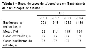 A meta do PNCT prevê que 1% da população do Município seja investigada através da baciloscopia direta de escarro.(11) Em Bagé, a população prevista para 2005 foi de 120.129 mil habitantes.(14) Assim sendo, de 2001 a 2004, foi estipulada a realização anual de 1.180 baciloscopias de escarro de primeira amostra.(11) O número esperado de novos casos de tuberculose pulmonar para o período de 2001 a 2003 foi de 87 para cada ano, mas já para 2004 este número diminuiu para 59 novos casos. As metas de atingir 1% da população foram atingidas em 2003 e 2004(15) (Tabela 1).