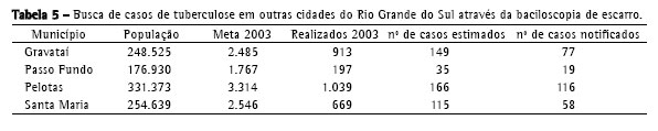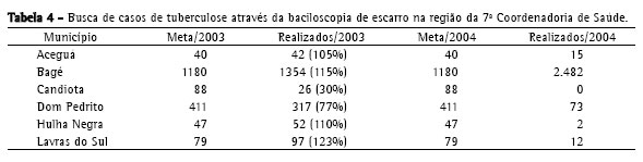 Nos últimos quatro anos, a busca de casos de tuberculose em Bagé teve aumento significativo, chegando a superar a meta nos dois últimos anos. Ao mesmo tempo em que isso ocorreu, o número de novos casos diminuiu. A superação das metas nos leva a considerar que alguns fatores sejam os responsáveis, como a procura e divulgação do serviço no município e a busca ativa por novos casos, de boa qualidade. Para fins de comparação, têm-se as metas de 2003 e 2004 dos Municípios que compõem a 7ª Coordenadoria Regional de Saúde(15) (Tabela 4). Pode-se observar que Bagé foi o único município que conseguiu atingir a meta (investigar 1% da população através da baciloscopia direta de escarro) estipulada pelo Ministério da Saúde em 2003 e em 2004. Esse fator também foi observado em relação a outros municípios considerados prioridade em tuberculose no Rio Grande do Sul, onde se averiguou que nenhum destes municípios havia realizado o número mínimo necessário de exames(8,15) (Tabela 5).
