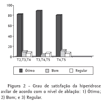 Objective: To compare different levels of ablation in terms of the degree of patient satisfaction and extent of postoperative reflex sweating in sympathectomized patients. Methods: A retrospective study involving 521 patients with primary hyperhidrosis, submitted to thoracic sympathectomy at the Monte Sinai Hospital and University Hospital of the Federal University of Juiz de Fora, from January of 2001 to December 2005. All patients were submitted to thermal ablation of the sympathetic stem and were divided into three groups: up to T2 (group I, n = 162); up to T3 (group II, n = 65); and up to T4 (group III, n = 294). Results: Optimal postoperative control of palmar/axillary hyperhidrosis was achieved in, respectively, 94/82% of the patients of group I, 89/89% of those in group II and 80/80% of those in group III. Postoperative reflex sweating was observed in 67% of the patients in groups I and II, compared with 61.29% of those in group III. Severe reflex sweating occurred in 32% of the group I patients, 9% of the group II patients and 4% of the group III patients. Conclusion: Sympathectomy provided excellent patient satisfaction and a low incidence of complications. There was no significant difference between the levels of ablation in terms of reflex sweating, although the intensity of this complication decreased when lower levels of blockage, principally at the T4 level, were employed.