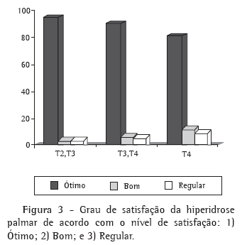 Com relação ao grau de satisfação por território, 94% dos pacientes do grupo I, com hiperidrose palmar, consideraram o resultado da simpatectomia ótimo, e 3% consideraram o resultado bom. Ótimo também foi considerado por 89% dos pacientes do grupo II, e bom por 6%. Nos pacientes do grupo III, 80% consideraram o resultado ótimo, e 12% bom. Na hiperidrose axilar, 82% dos pacientes do grupo I consideraram o resultado da simpatectomia ótimo e 10% bom, sendo ótimo também em 89% dos pacientes do grupo II e bom em 5%. Nos pacientes do grupo III, 80% consideraram o resultado ótimo e 12% bom, dados estes estatisticamente significativos. (Figura 3 e 4)