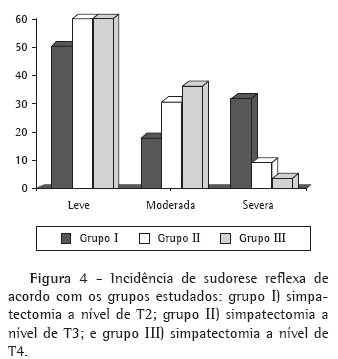A sudorese reflexa considerada severa ocorreu em 32% dos pacientes do grupo I, 9% do grupo II, e 4% do grupo III (p < 0,05). A forma moderada ocorreu em 18% dos pacientes do grupo I, em 31% dos pacientes do grupo II, e 36% no grupo III. Já a forma leve ocorreu em 50% no grupo I e 60% nos grupos II e III. Estas categorias foram apresentadas aos pacientes que relataram qualquer grau de hiperidrose reflexa, quando lhes pedimos que caracterizassem seu quadro clínico. (Figura 2)