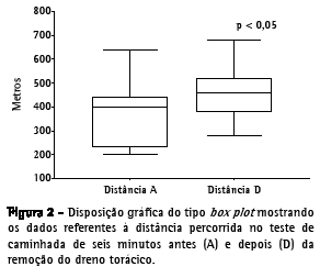 Em 2001, alguns autores avaliaram o efeito da remoção precoce do dreno torácico sobre o desempenho no TC6 no pós-operatório de ressecção pulmonar.(6) A distância percorrida no TC6, avaliado uma semana após a cirurgia, foi comparada entre um grupo de pacientes submetido à remoção precoce do dreno e outro grupo de pacientes submetido à abordagem tradicional (tempo médio de uso do dreno, 1,5 vs. 2,8 dias, respectivamente).