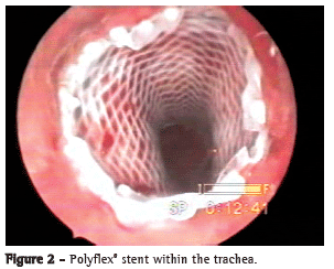 One group of authors used the Polyflex® silicon stent in an experimental model of induced tracheal stenosis in pigs.(12) The tracheal stenosis was induced according to technique developed by another group of authors,(7) who evaluated the aspects related to the application of stents and their short-term results. They concluded that the stent, from a technical point of view, is easy to insert and remove. All of the animals presented clinical improvement, although the stent migration rate was quite high.