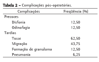 As complicações pós-operatórias imediatas observadas foram: disfonia em dois pacientes (12,5%) e odinofagia em dois pacientes (12,5%). Essas complicações ocorreram em pacientes que tinham estenoses altas, próximas à glote. Os sintomas regrediram em três pacientes no primeiro mês pós-operatório. Apenas um dos pacientes com disfonia permaneceu sintomático por tempo prolongado, cerca de seis meses (Tabela 2).