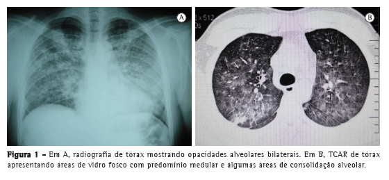 Tratava-se de um paciente de 29 anos, do sexo masculino, branco, casado, motorista, natural e procedente de Santa Maria, RS. Previamente hígido, há cinco meses iniciara com fadiga e dispneia aos médios esforços, acompanhadas de perda ponderal de 4 kg, sem acompanhamento médico no período. Nos quinze dias anteriores à admissão hospitalar, houve piora da dispneia, acompanhada de tosse seca persistente. Negava quaisquer outros sintomas. Encontrava-se em bom estado geral, eutrófico, lúcido, orientado, coerente, com mucosas úmidas e descoradas (3+/4+), anictérico, acianótico, eupneico, com sinais vitais dentro dos limites da normalidade e SpO2 em ar ambiente de 98%. O exame cardiopulmonar, neurológico e abdominal não mostrou anormalidades. Não apresentava lesões cutâneas ou articulares, edema periférico ou hipocratismo digital.
