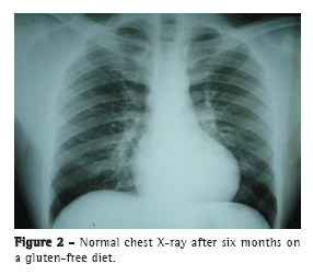 É importante confirmar a presença da doença celíaca, pois é sabido que o tratamento com a dieta livre de glúten pode auxiliar na regressão de todos os sintomas e proporcionar uma melhora radiológica na maioria dos indivíduos,(8) como visto no presente caso clínico. O acompanhamento nutricional em longo prazo também é importante, pois há registros de que a má adesão à dieta pode reativar os sintomas respiratórios e gastrointestinais.(3)