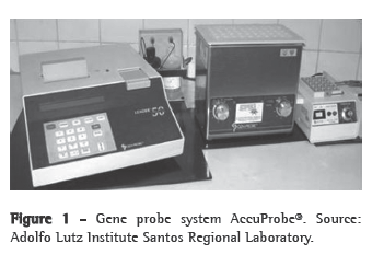 The use of the gene probe system AccuProbe® (Gen-Probe Inc., San Diego, CA, USA) was performed by the IAL Santos Regional Laboratory. This is a molecular method that uses an acridine ester-labeled single-stranded DNA probe complementary to the rRNA of the target microorganism. After cell lysis, the rRNA is released, and the labeled probe combines with the rRNA, forming a probe+rRNA complex. The complex formed is detected by chemiluminescence using a luminometer, the amount of light produced being proportional to the amount of probe+rRNA complex present in the sample.(6,11) The manufacturer recommendations were strictly followed throughout the procedure.(13)