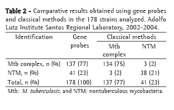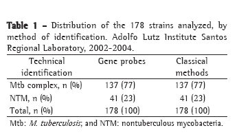 The tuberculosis referral laboratory in the greater metropolitan area of Santos, the IAL Santos Regional Laboratory, has used gene probes to identify M. tuberculosis complex mycobacteria since 2002.