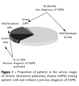 Figure 1 shows the percentage of patients diagnosed with COPD according to the severity of the disease. Of the 18 patients in whom a previous diagnosis of COPD had been confirmed by spirometry, 10 (56%) presented the mild or moderate form of the disease, and 8 (44%) presented the severe form. Of the 39 patients newly diagnosed with COPD, 38 (97.4%) presented the mild or moderate form of the disease, and only 1 (2.6%) presented the severe form.