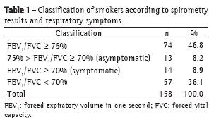 We evaluated 158 smokers, aged =40 years, of both genders, who participated in the Paulista State University at Botucatu School of Medicine smoking cessation program between January of 2003 and November of 2005. In order to be included in the program, patients reported their smoking and clinical history, which included a specific survey on the presence of respiratory symptoms and previous diagnosis of COPD and other tobacco-related diseases.